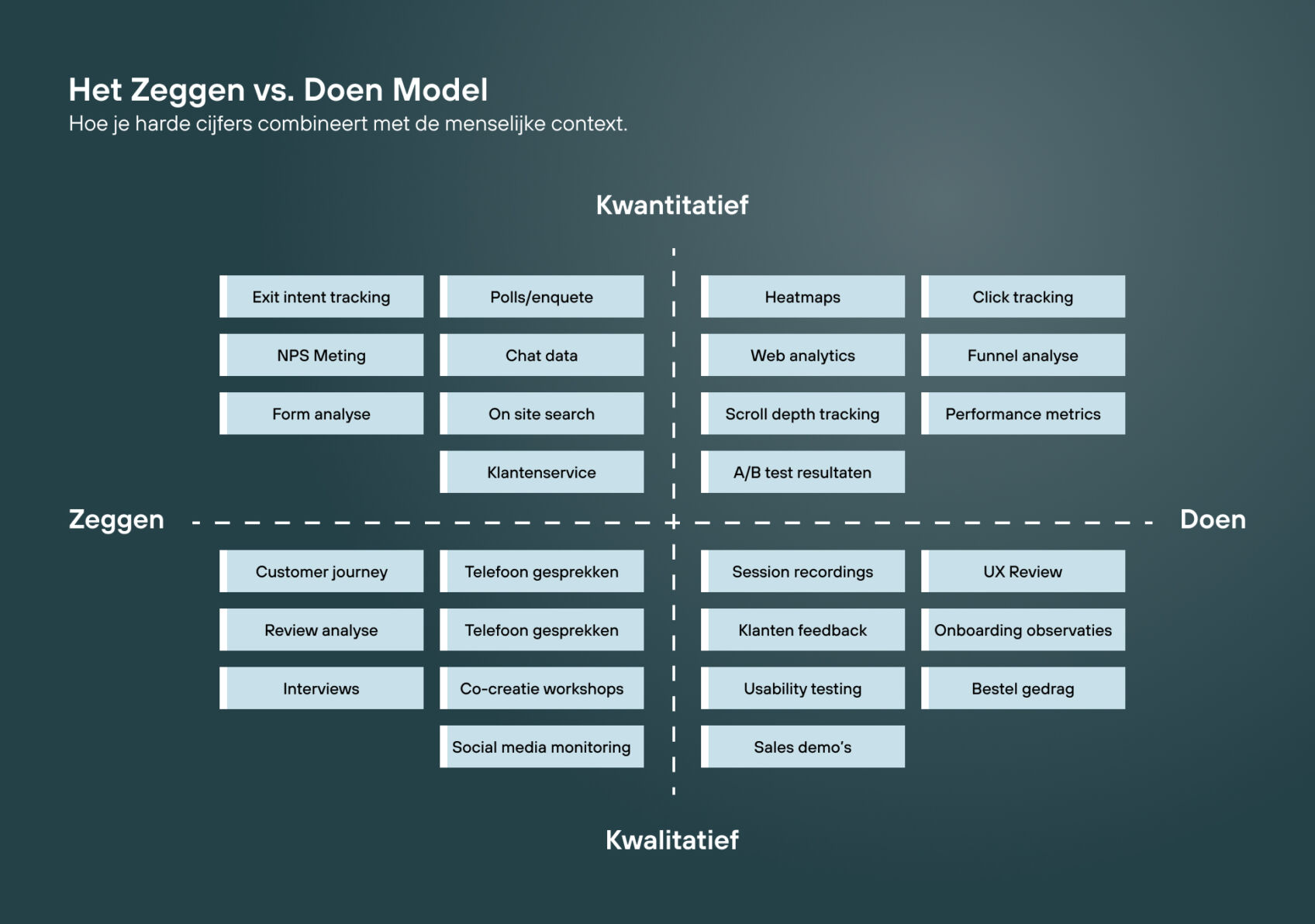 • Kijken we naar harde cijfers (zoals in Analytics) of naar de menselijke context (zoals in een interview)?